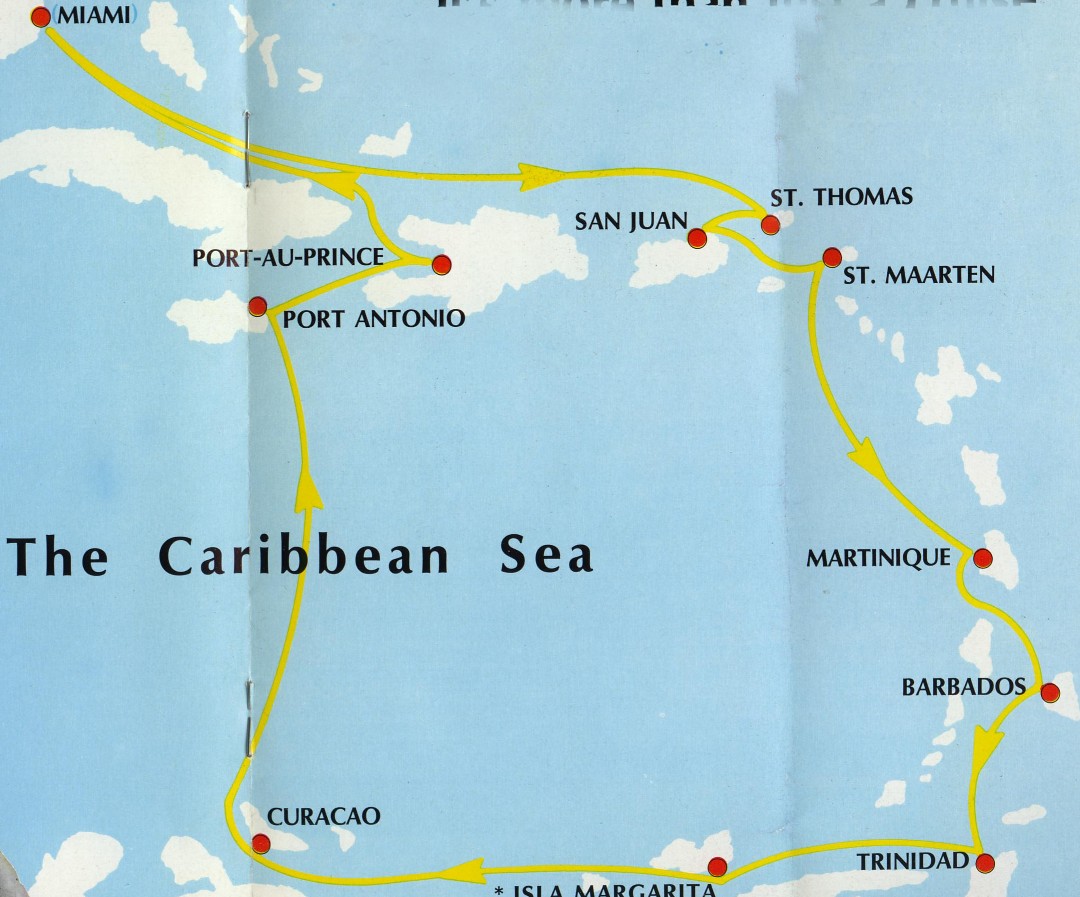 The initial cruises for this elegant trendsetter was, for the known part, a repeat of her maiden voyage revisiting the same ports. The first of the year was made on January 5th, then again on January 19th, and in the "High Season" on February 2, and 16th and lastly on March 2, 1974. The first port was St Thomas, at one point called "a paradise of supermarkets" and ideal for sightseer who likes to shop. San Juan, the capital of Puerto Rico, and St Maarten a place for beaches and green hills and valleys were the next two ports. Martinique was fourth, a port where passengers could enjoy Fort-de-France for a day and the charm of this French Island. The island ports of Barbados, and Trinidad were further south, with the former easily called a West Indian version of England. Isla Margarita was a call that was dependant on the weather, nevertheless a place of white beaches and colonial architecture. Curacao, Port Antonio and lastly the capital of Haiti, Port-Au-Prince was seen last on the voyage before her return way-point to Florida.19747 day "Odyssey Cruises"