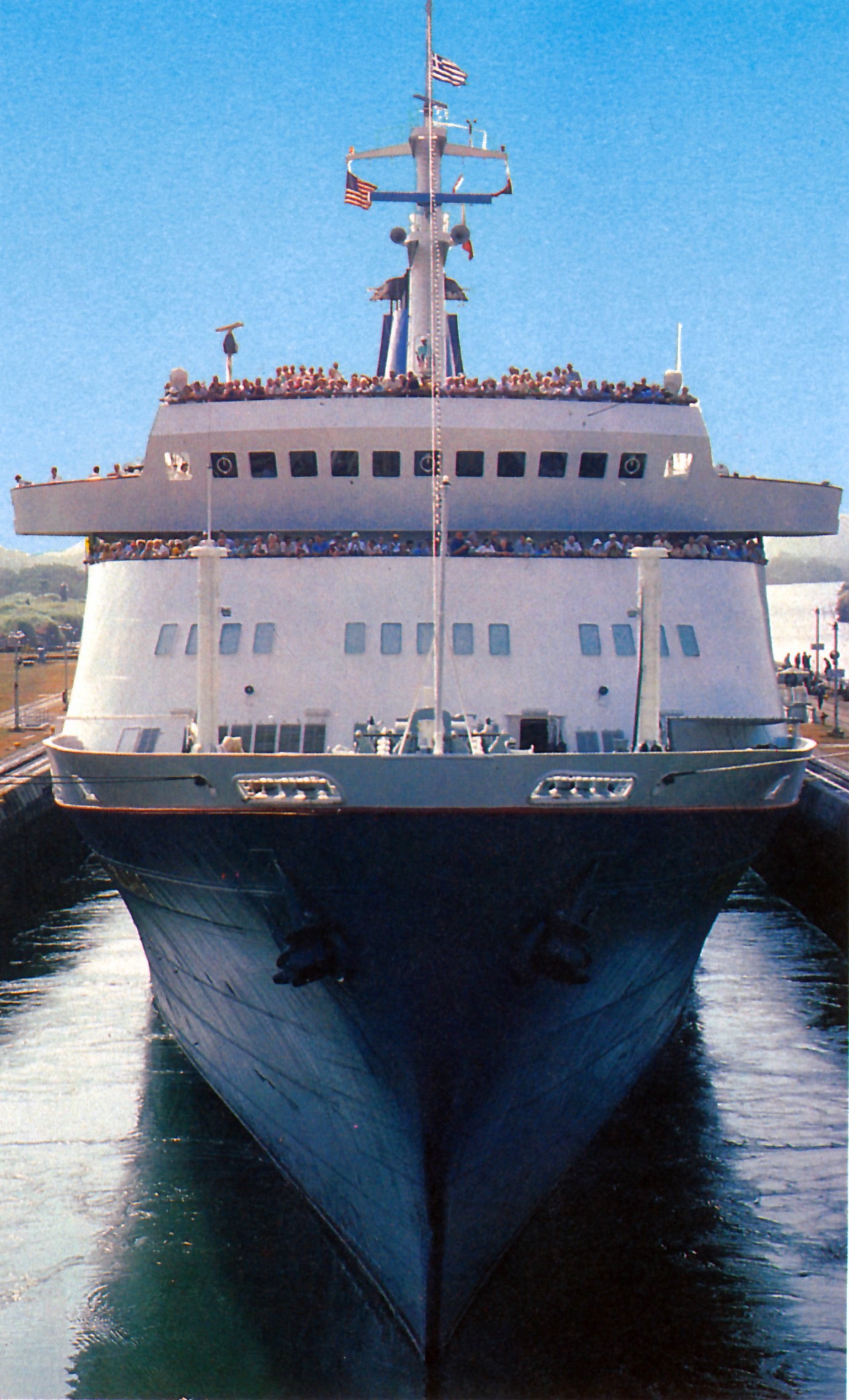 Left, a fine view of the STELLA SOLARIS, and above, making her way through the Gatun Locks and the modern Wonder of the World that is the Panama Canal. Sun Line