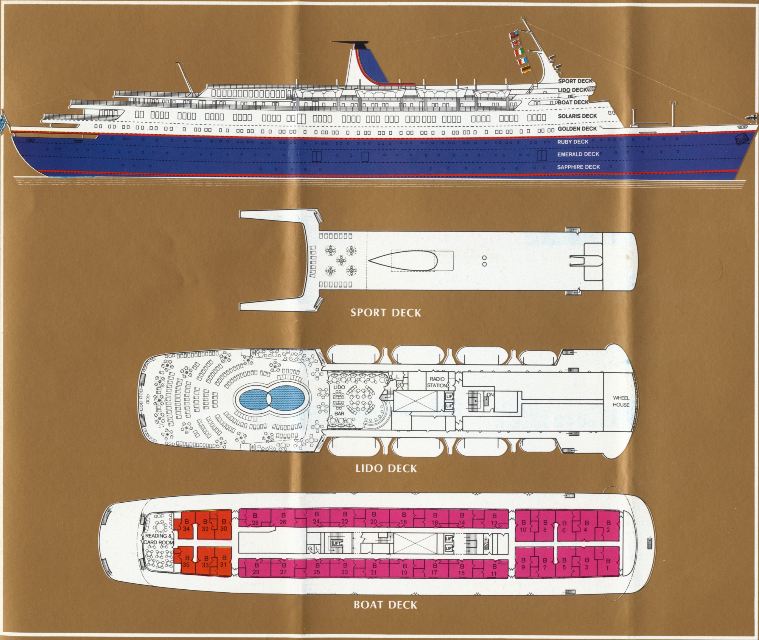 At the peak of the 9 deck STELLA SOLARIS begins the Sports Deck. We start at the forward end from atop the wheelhouse continuing with the funnel and from here it splits into two seperate walkway wings that surround the lido below, providing a spacious and uncluttered look over the pool area. On the next level down we find the Lido Deck and much like the Sports Deck, starts off with the wheel house, the interiors of which houses the chart room and all equipment necessary to navigate the ship to her destinations. Following aft of this we come across a narrow outside walkway inboard of the lifeboats, sheltering the Lido on either side of the vessel, glass paned windbreaks were found just aft of the lifeboats. The inside portions of the Lido deck following the bridge were officer accomodations and the radio station. In the aft enclosure, the 100 capacity Lido Bar offered up buffet style portions of Greek and Continental cuisine as supplied by Sun Line. The Bar in fact had a direct view to the pool area via a large glass screen.