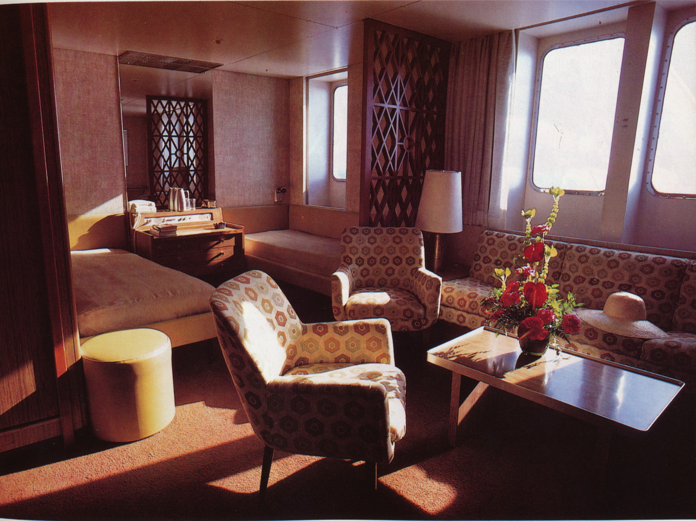 Within reach of her newly revised capacity of 765 one-class passengers lay artwork and décor of enormous quality and detail consisting of ancient Greek themes. This highly acclaimed décor with which she became known for included ceramic, metal and velor elements. Indeed the very same elements that were so unique to her own that nothing like it could be found in any other liner sailing at the time- nor has the world seen anything of the like since then(this feat been repeated since then.)