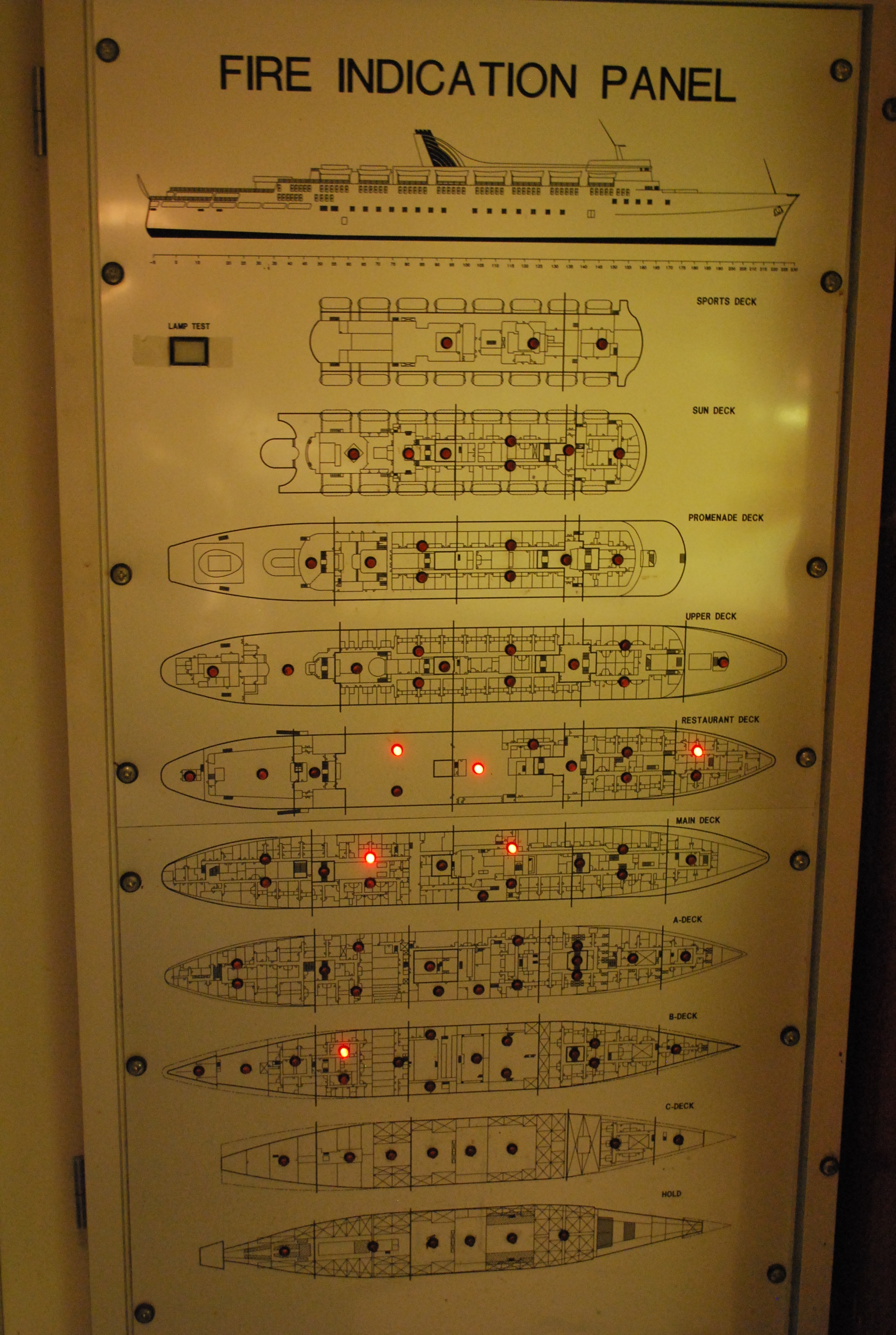 The fire panel on the left was located in the chartroom, installed during early Commodore days as evident by the funnel in the etched profile. The other panel on the right was located on the aft bulkhead of the bridge.